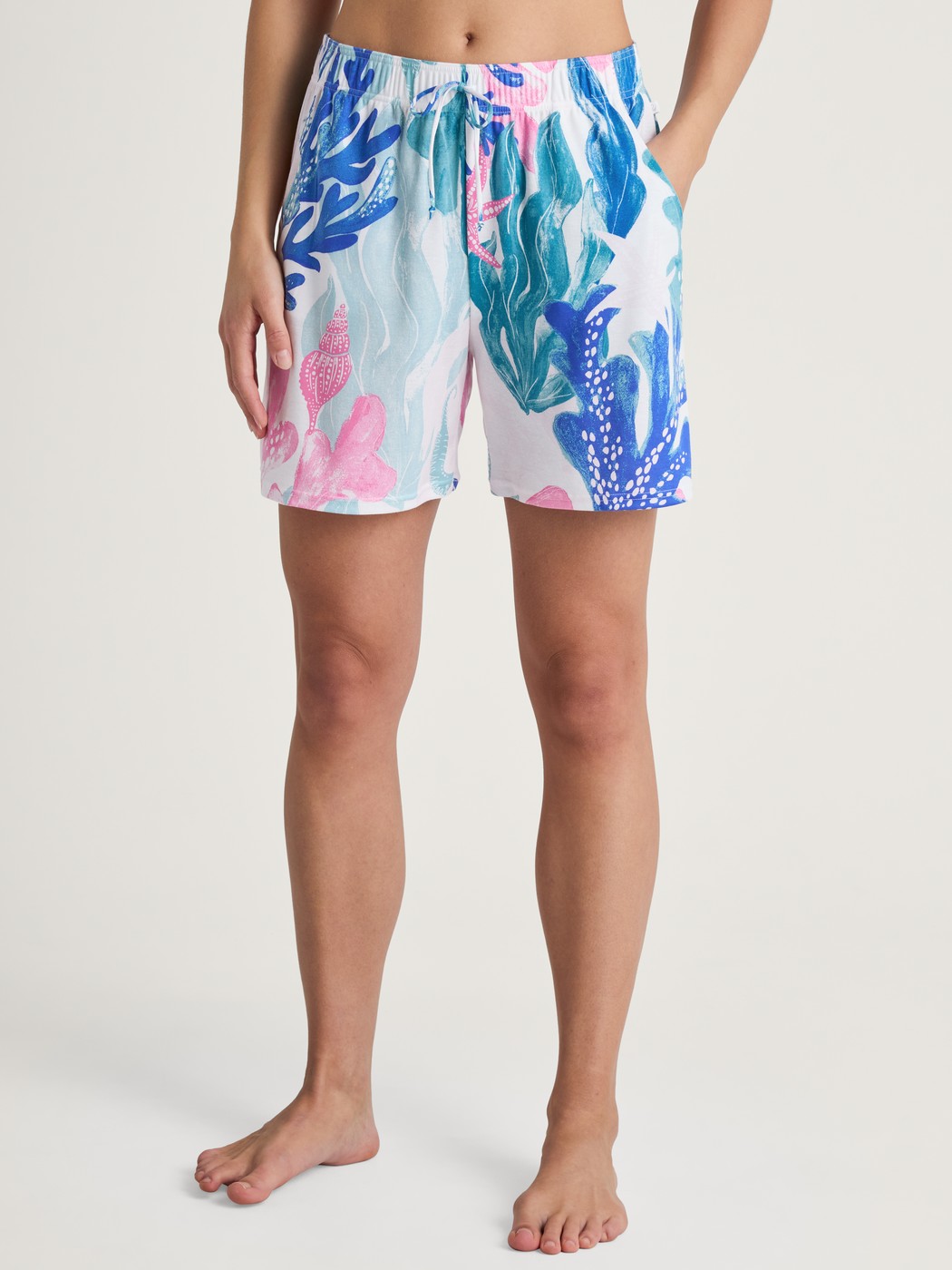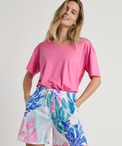 The FAVOURITES COAST mix & match range brings summer flair with an underwater world print in carnation pink on shorts, 7/8 trousers and a short-sleeved dress with a slight drape. The pieces are made from soft swiss+cotton/TENCELâ„¢ modal superlight fabric, which ensures lightness and breathability. A retro parasol stripe print in ice green adorns a short-sleeved nightshirt and straight-cut trousers. Plain-coloured T-shirts, shorts with a lace hem and 7/8 trousers in a Vichy check pattern complete the collection and offer maximum versatility. The wide range of possible combinations creates light, summery favourite outfits.