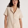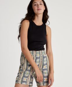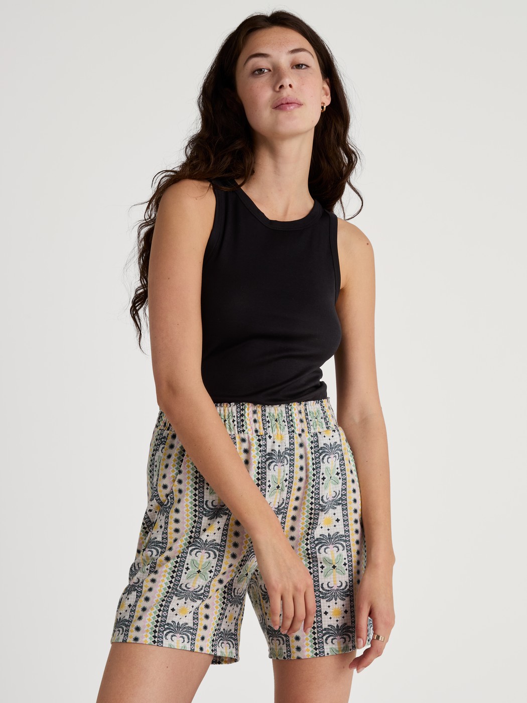 The FAVOURITES SUN mix & match range brings joie de vivre and feel-good moments. Stylish palm tree and sun elements in shades of yellow, beige and black create a warm look. Highlights include a boxy-cut short-sleeved shirt and shorts in dune beige muslin, which can be worn as a set or combined in a variety of ways. The collection is complemented by a sunshine yellow T-shirt, shorts and capri trousers with a Greek boho-chic palm print, as well as V-neck shirts and trousers with a two-colour palm leaf print. Perfect for creative looks – within the range and beyond.