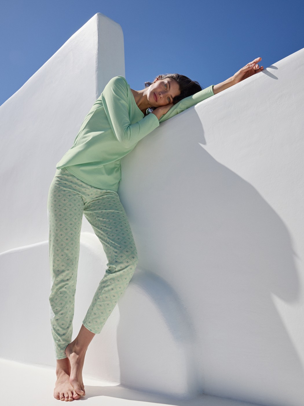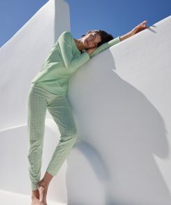 The FLOWER NIGHTS line embodies a soft femininity with a stylish floral print in pastel green, evoking the botanical diversity of Greece. Made from skin-friendly organic cotton, these pieces ensure a restful night’s sleep and feel gentle against the skin.